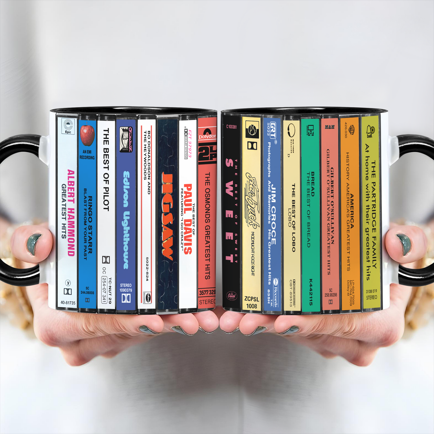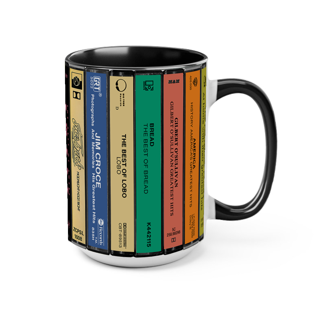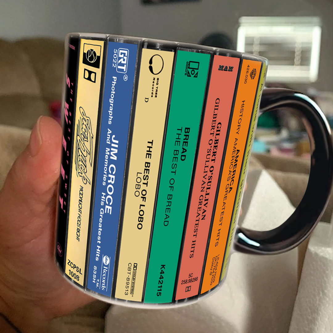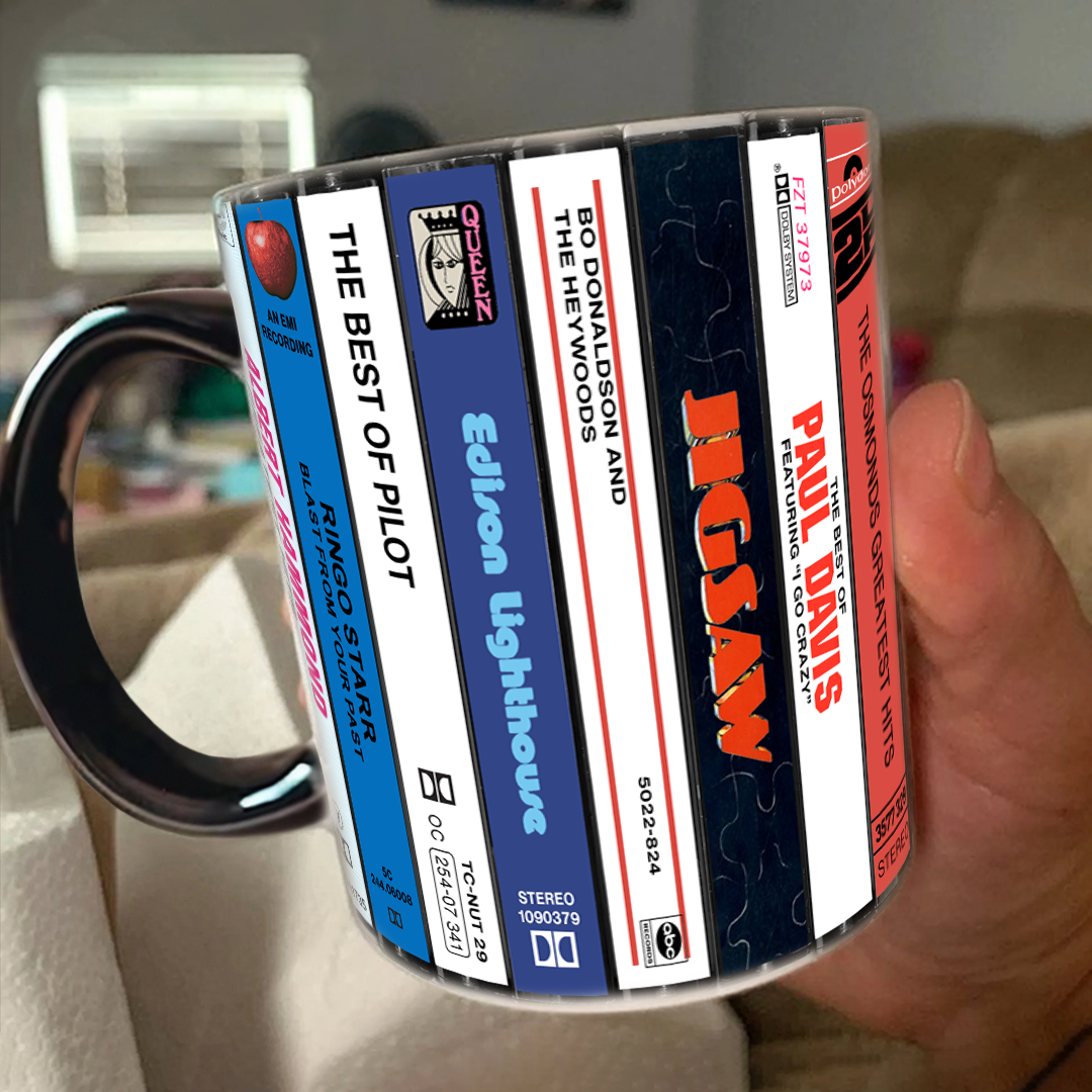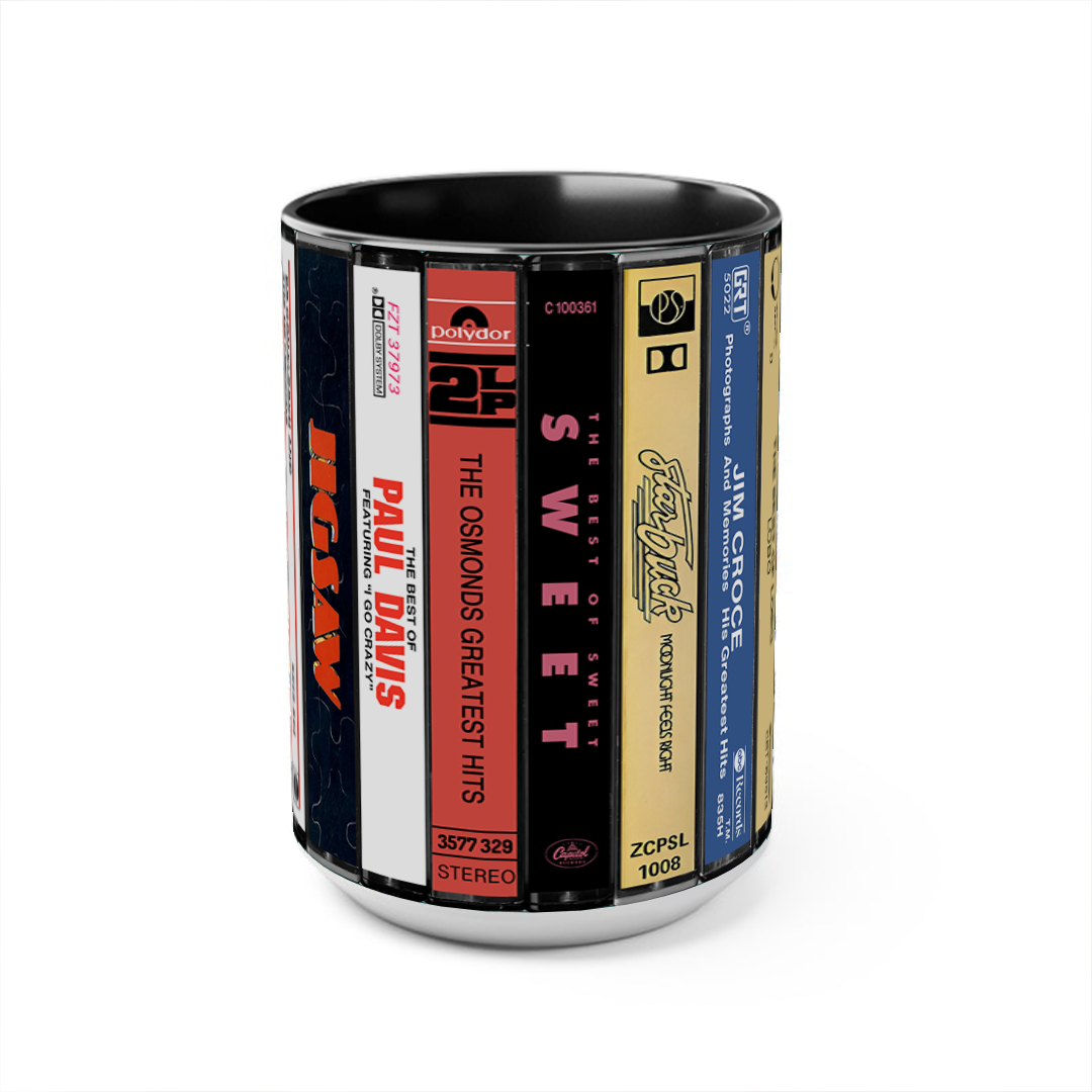 Experience the Nostalgia of the 70s with Our 70s Pop Albums Cassette Collection Retro Accent Edge-to-Edge Printed Mug!