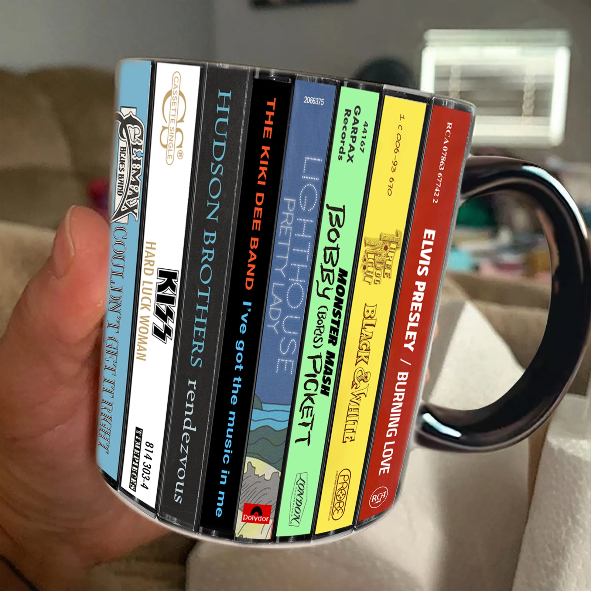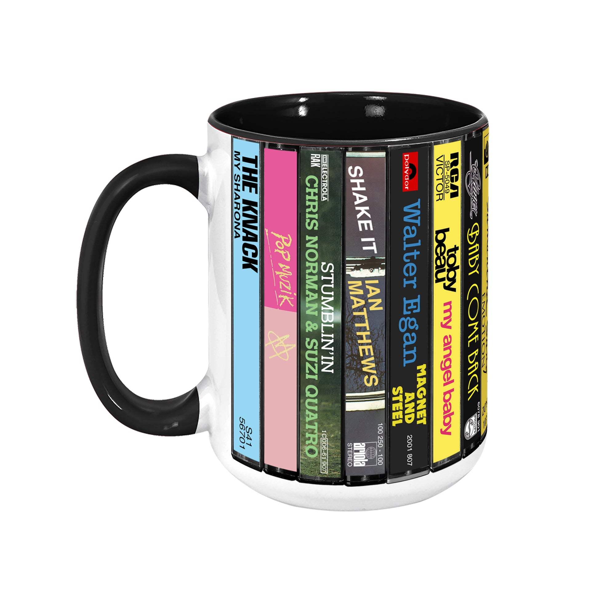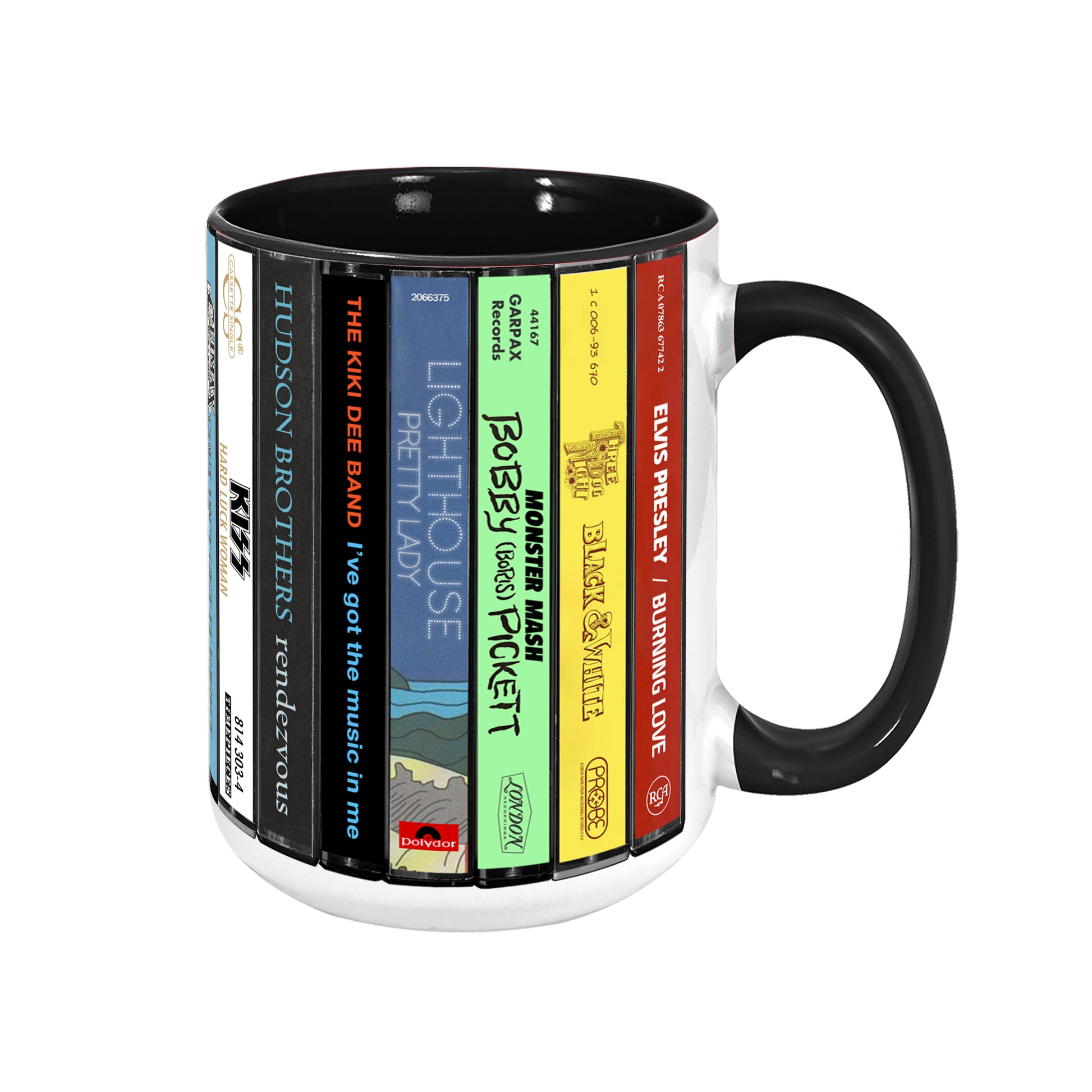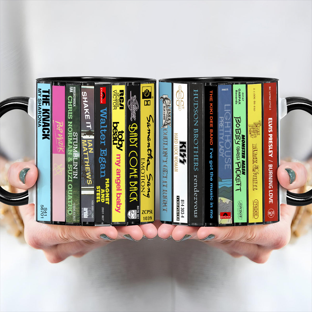 Experience the Nostalgia of the 70s with Our 70s Pop Albums Cassette Collection Retro Accent Edge-to-Edge Printed Mug!