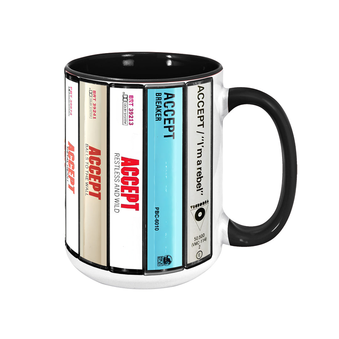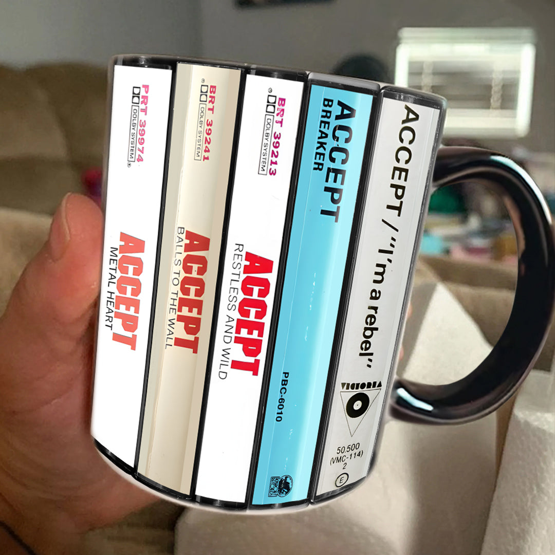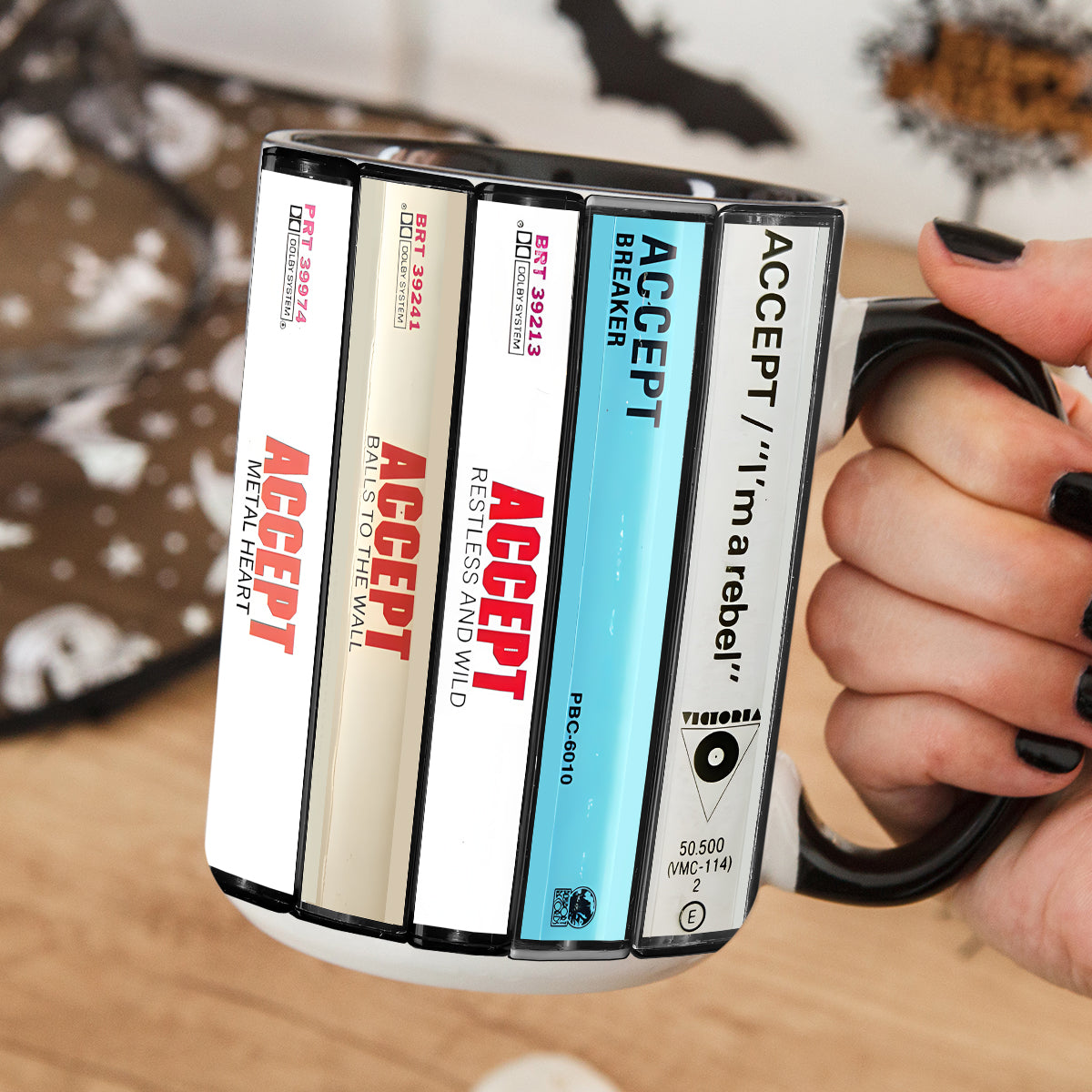 Our Cassette Accent Mug celebrating some of the greatest albums from Accept - Featuring the best 10 Accept albums in their original cassette format, and reimagined stacked and arranged in chronological order, resulting in an atmospheric print of colour type and image.