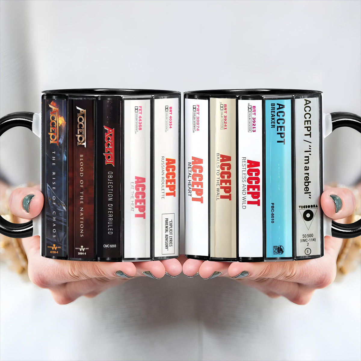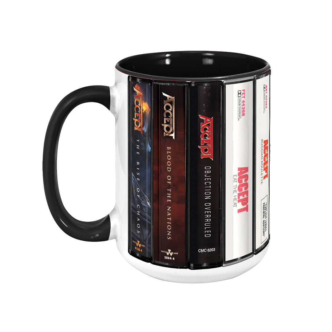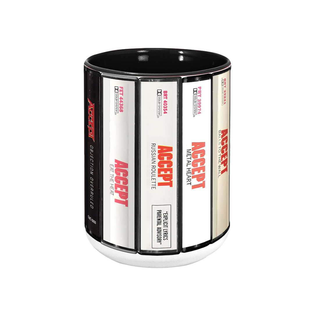 Our Cassette Accent Mug celebrating some of the greatest albums from Accept - Featuring the best 10 Accept albums in their original cassette format, and reimagined stacked and arranged in chronological order, resulting in an atmospheric print of colour type and image.