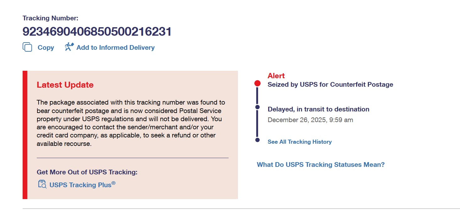 Package was seized by USPS for counterfeit postage. Scam company do not purchase