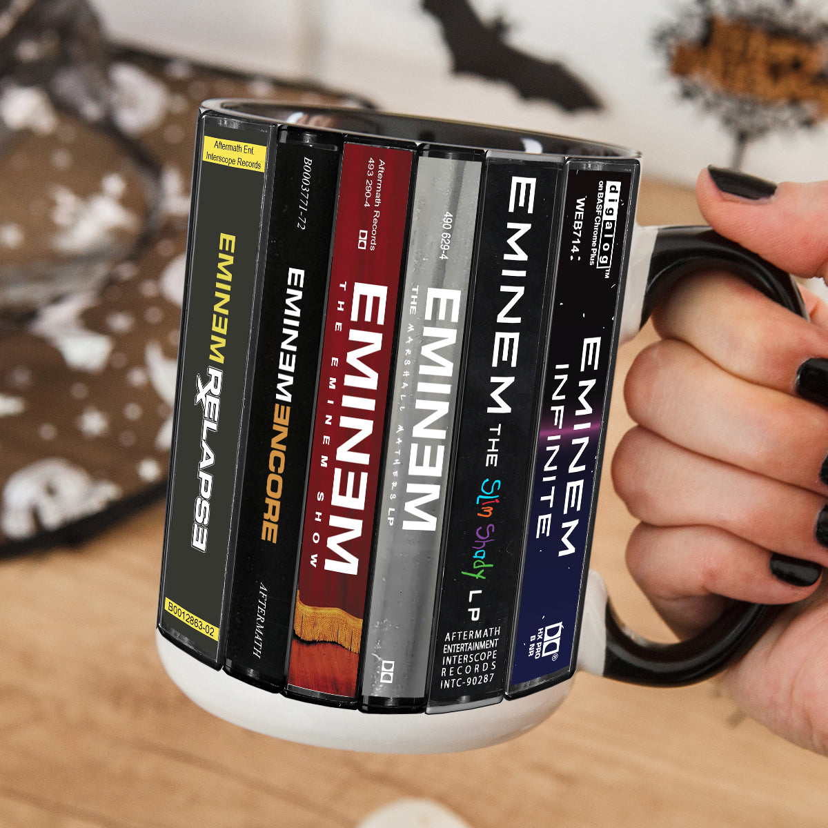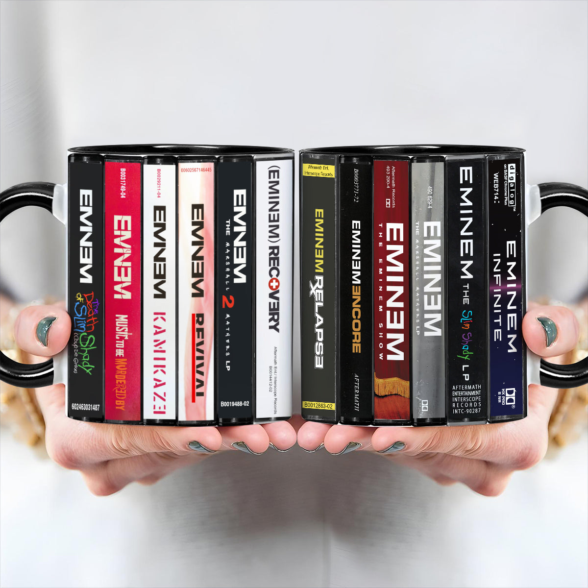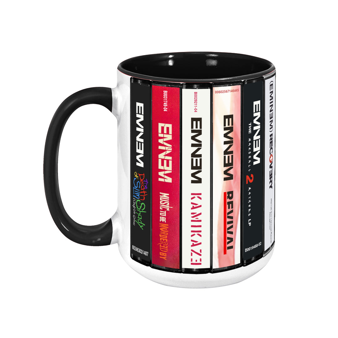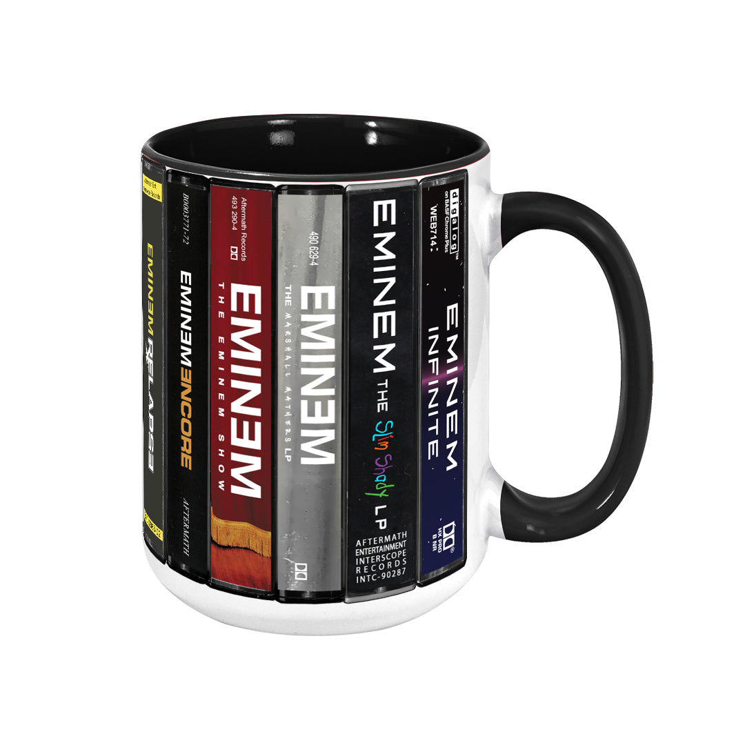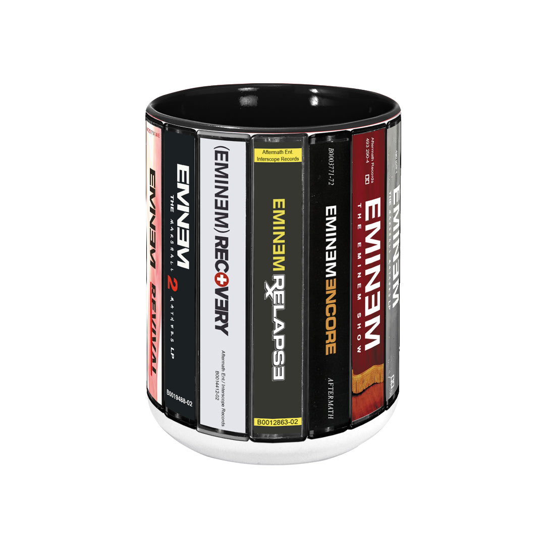 Add some retro flair to your morning coffee routine with the Eminem Albums Cassette Collection Retro Accent Edge-to-Edge Printed Mug. Featuring the original 12 best studio albums by Eminem in chronological order, this mug is a must-have for music enthusiasts. Made with high-quality materials and dishwasher/microwave safe, it combines style and convenience.