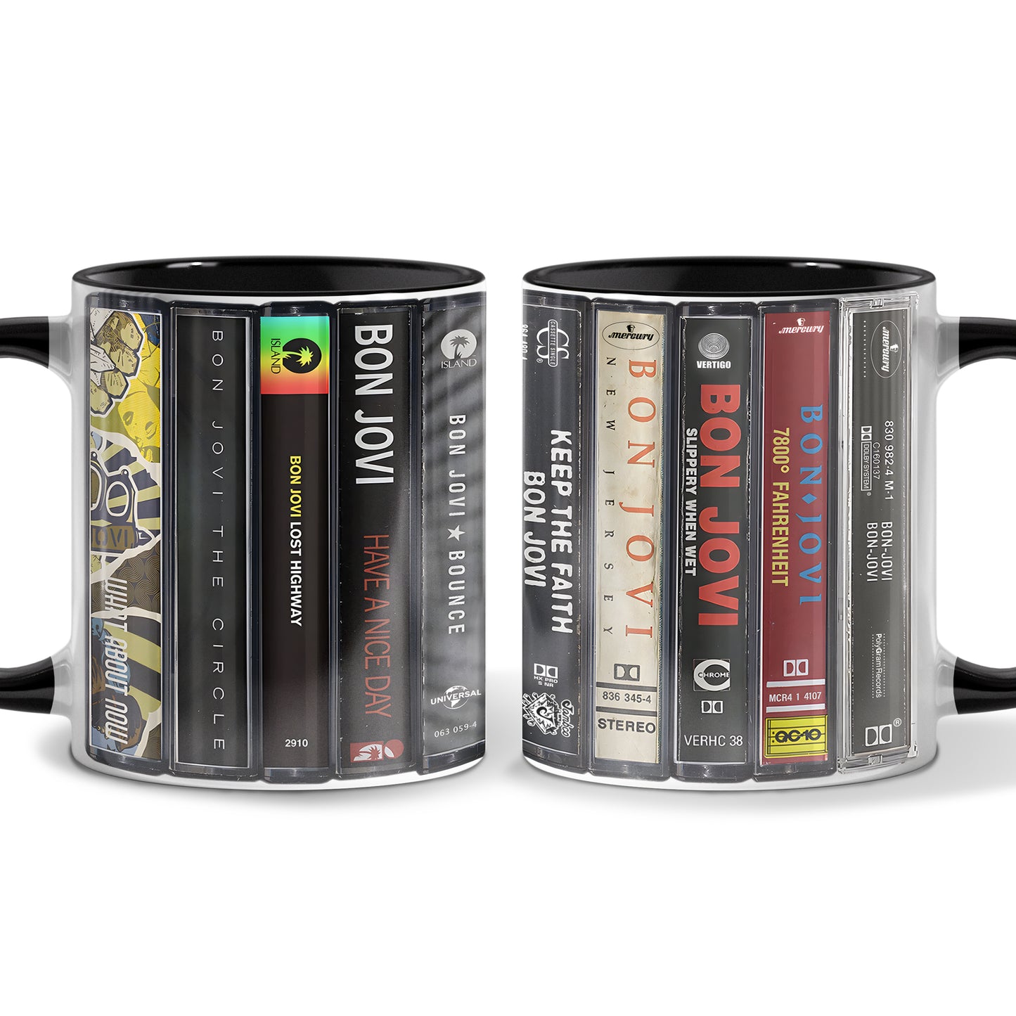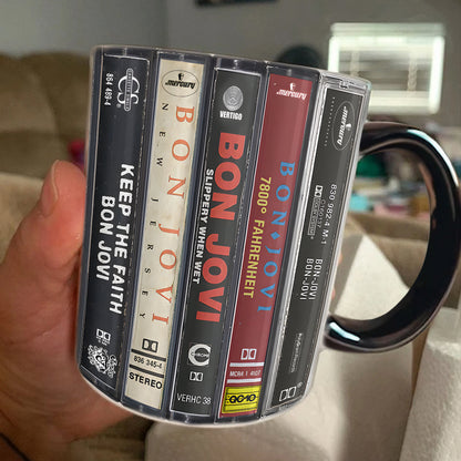 Experience a blast from the past with our Bon Jovi Albums Cassette Collection Retro Accent Mug. This mug features designs inspired by the iconic albums of Bon Jovi. Made with high-quality materials, it's a must-have for any fan and a great way to add a retro touch to your morning coffee.