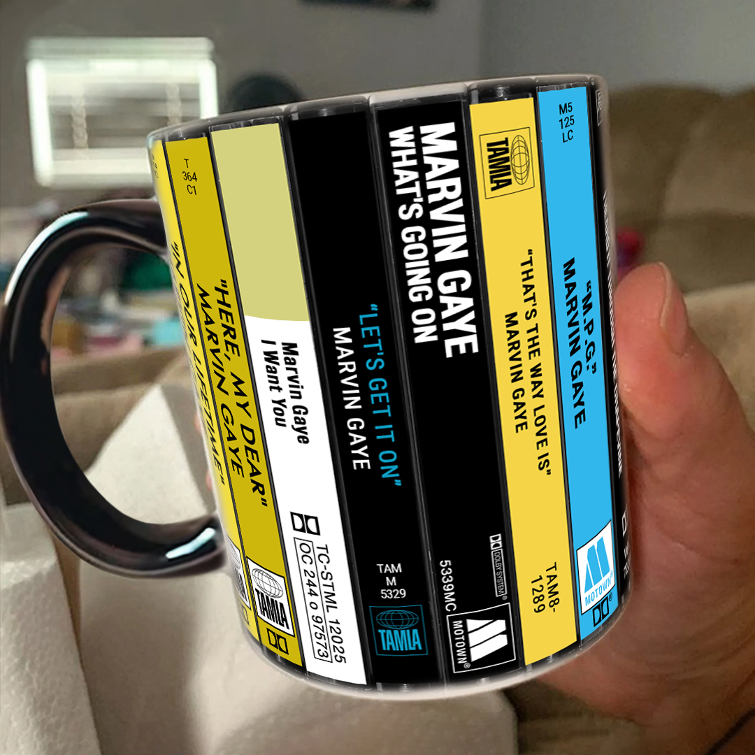 Add a touch of music nostalgia to your morning coffee routine with the Marvin Gaye Albums Mug!