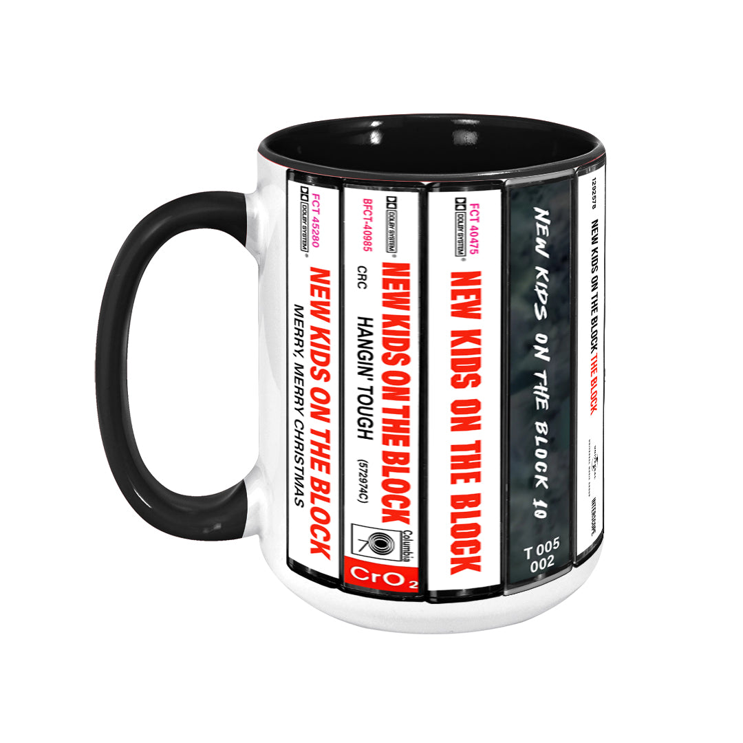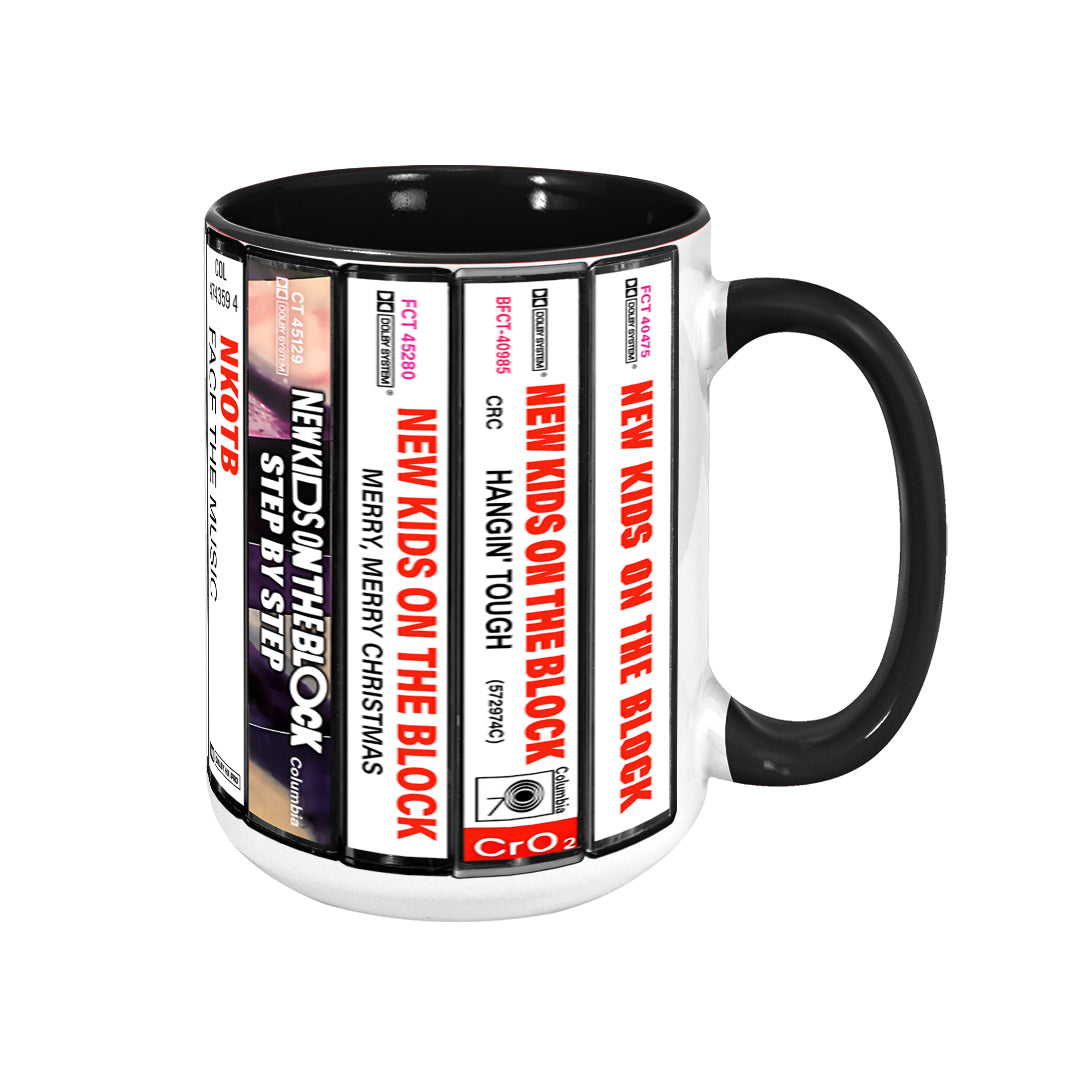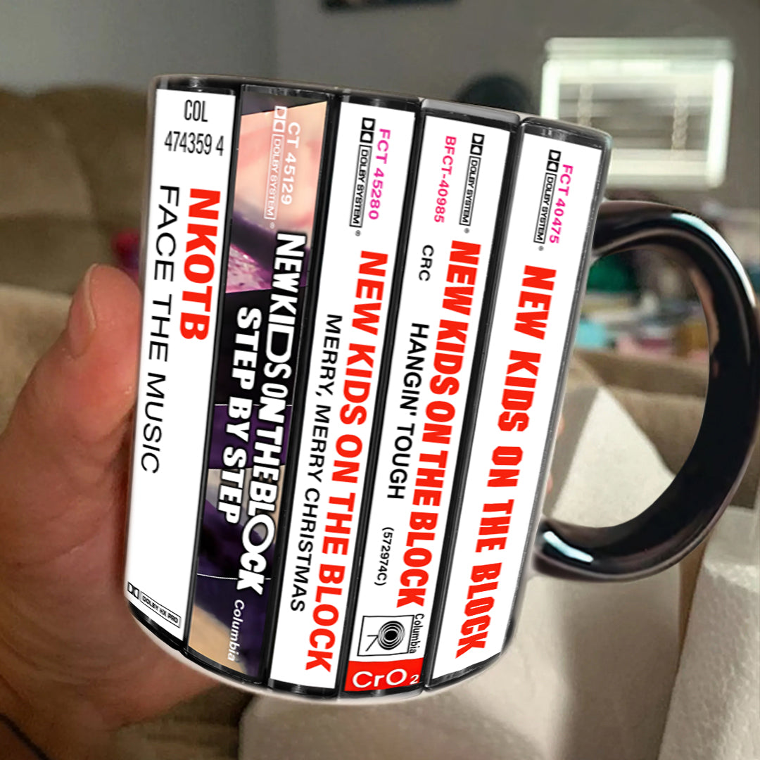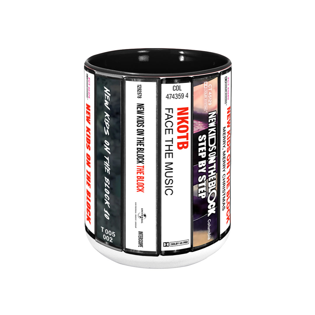 This retro accent mug features an exclusive New Kids on the Block albums cassette collection design. Show your fandom and enjoy your favorite album while sipping your drink of choice. Made with high-quality ceramic material, this mug is perfect for any NKOTB fan and makes a unique addition to any collection.