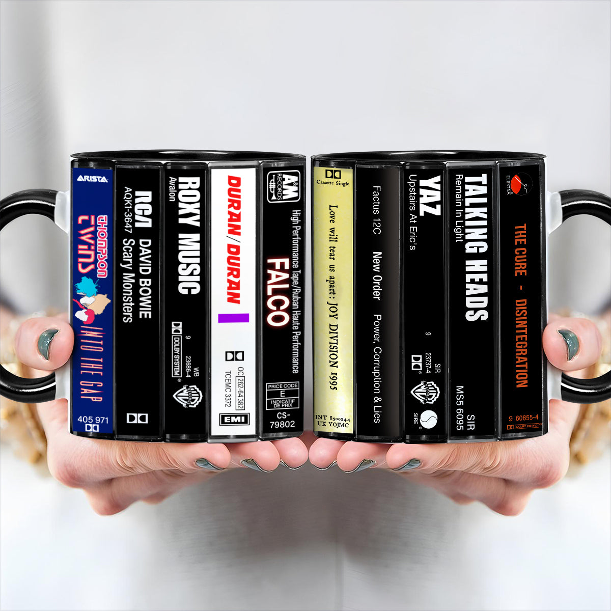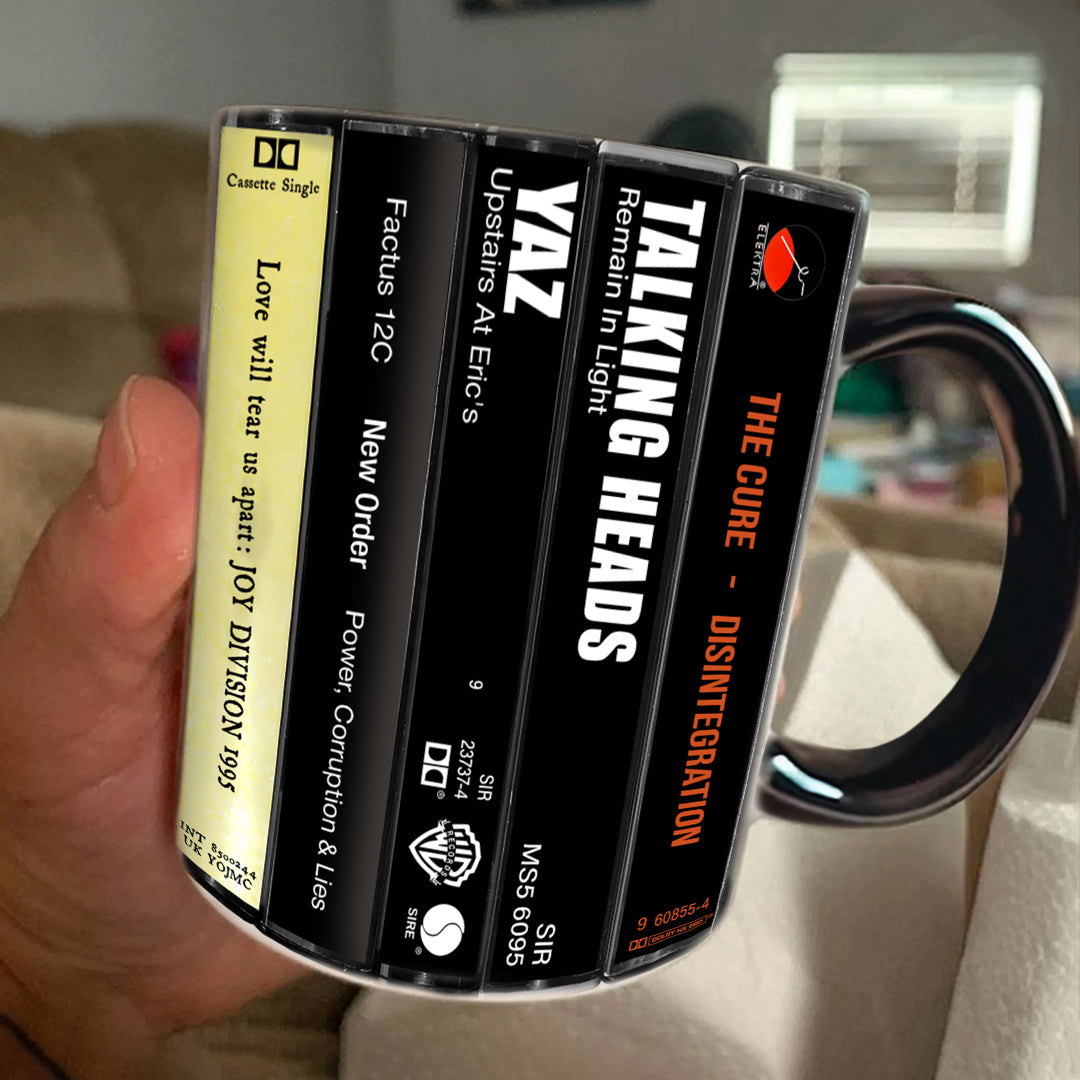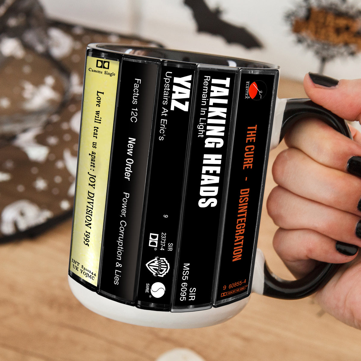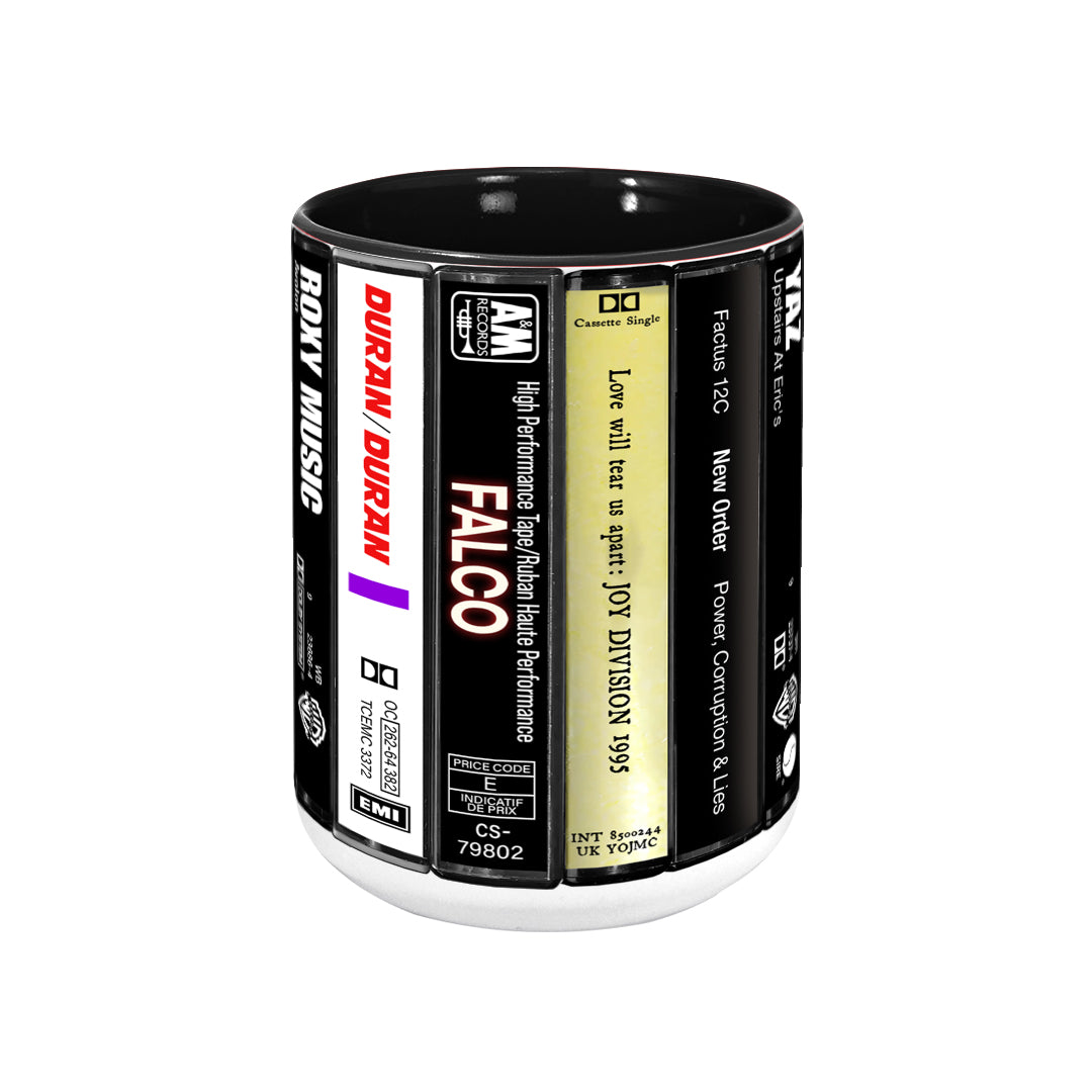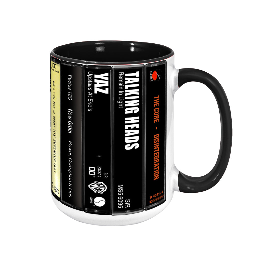 Our Cassette Accent Mug celebrating the discography of significant New Wave Albums - It features 10 New Wave Albums stacked and wrapped around the mug.